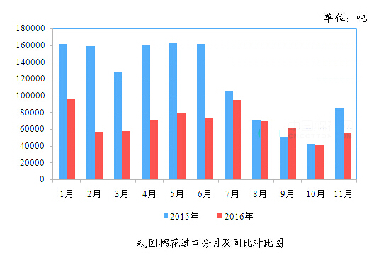 2016年11月我國棉花進口量同比下降34.92%